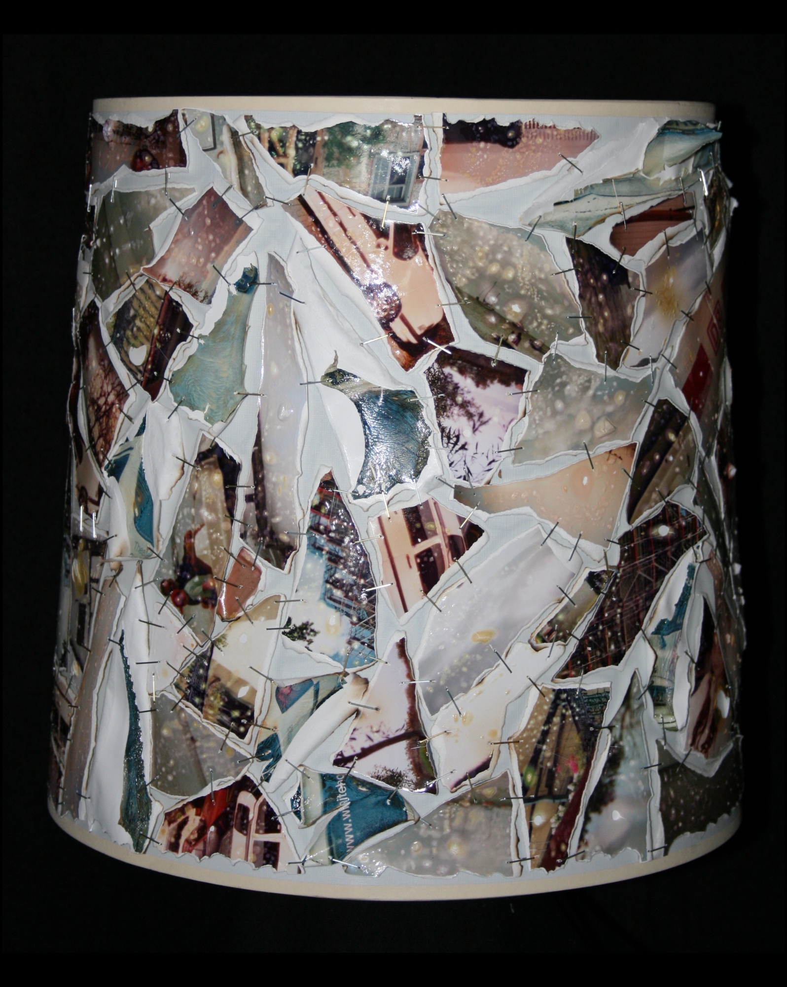 Material: Drahtgestell, Kunststoffform, Fotoschnipsel, Heftklammern