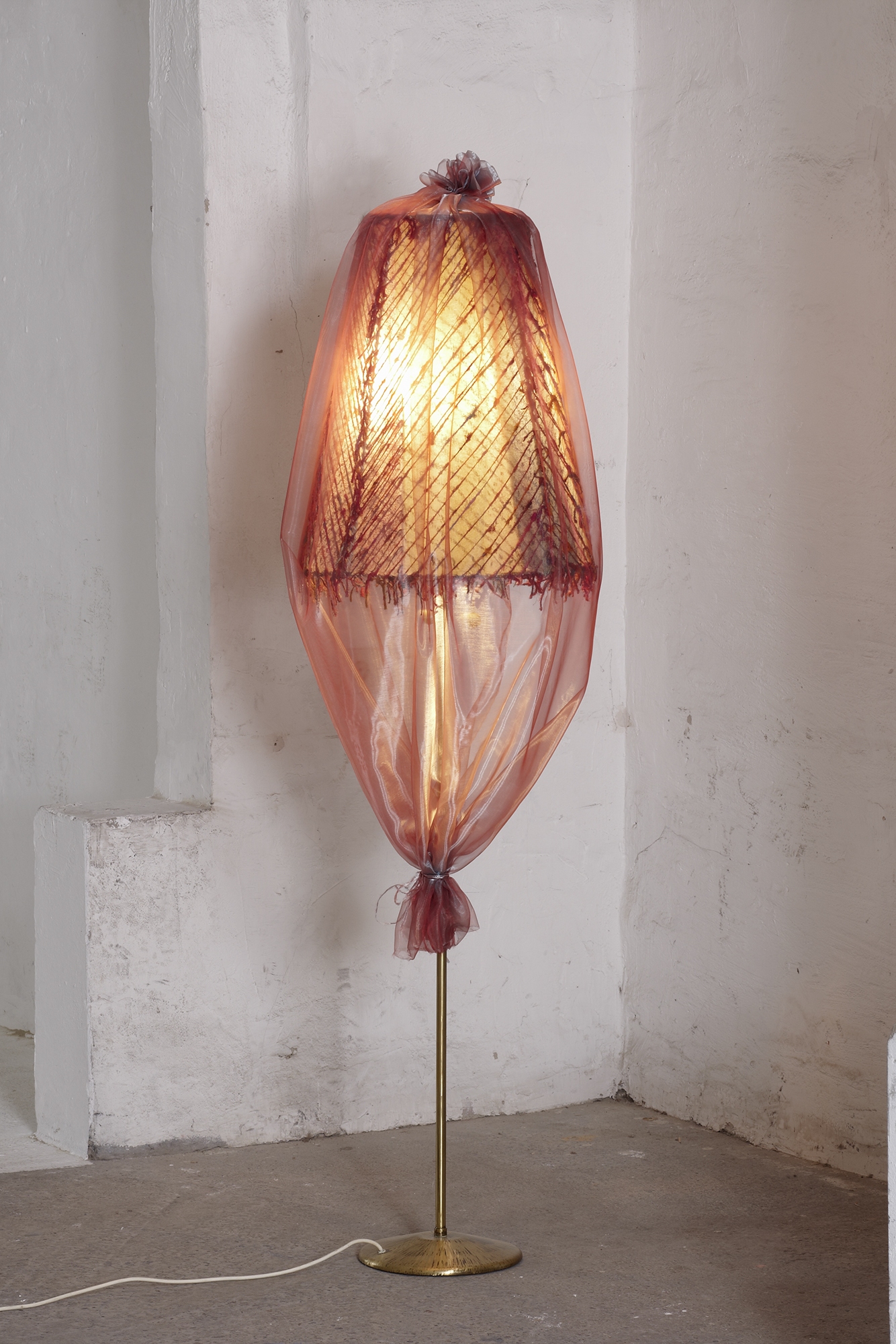 Material: Lampenschirm, Wachsmalkreide, Seidengarn, Organza, Messingständer