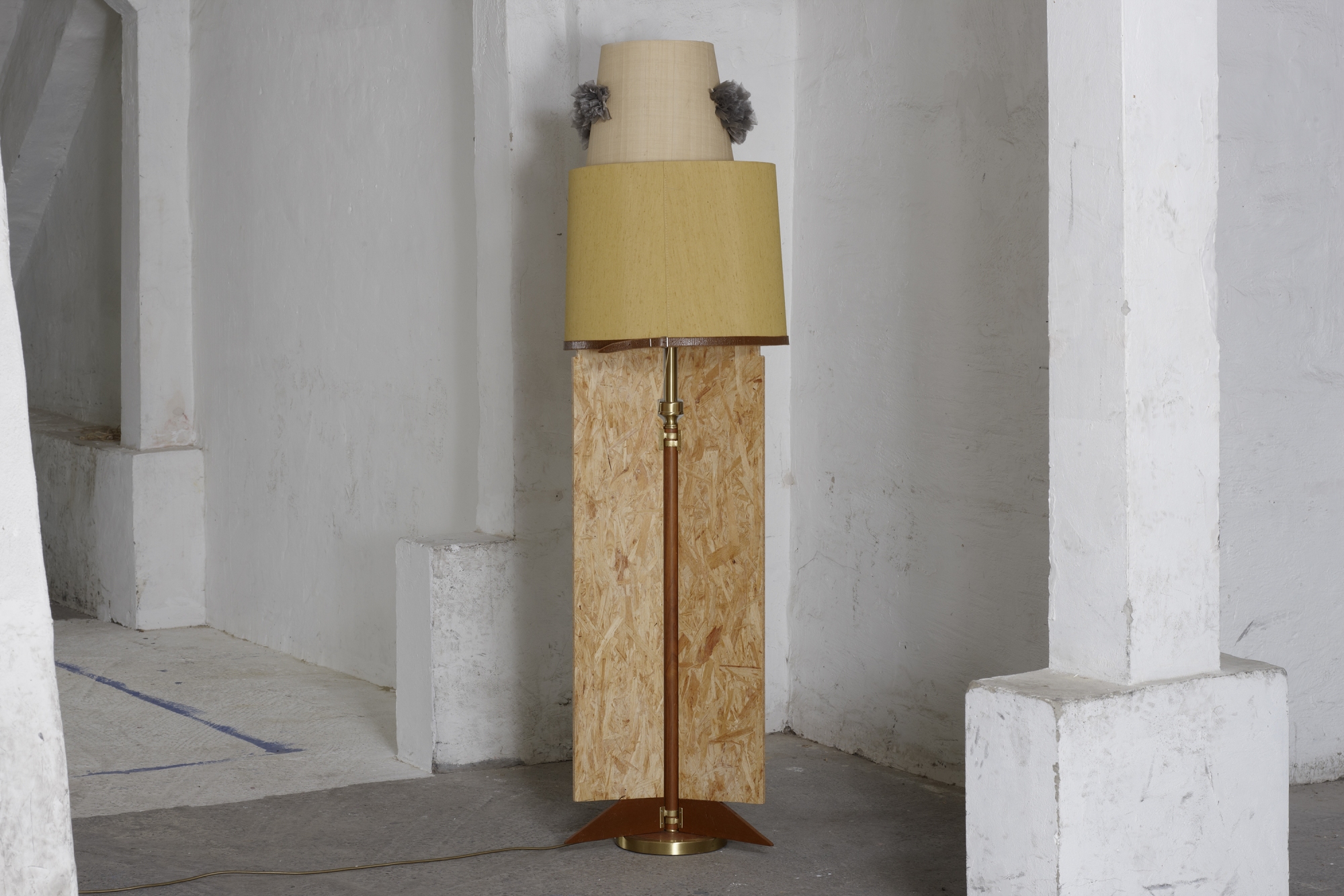 Material: Holz-/Metallständer, Leder, Lampenschirmseide auf Hartfolie, Organza, Wachsmalkreide